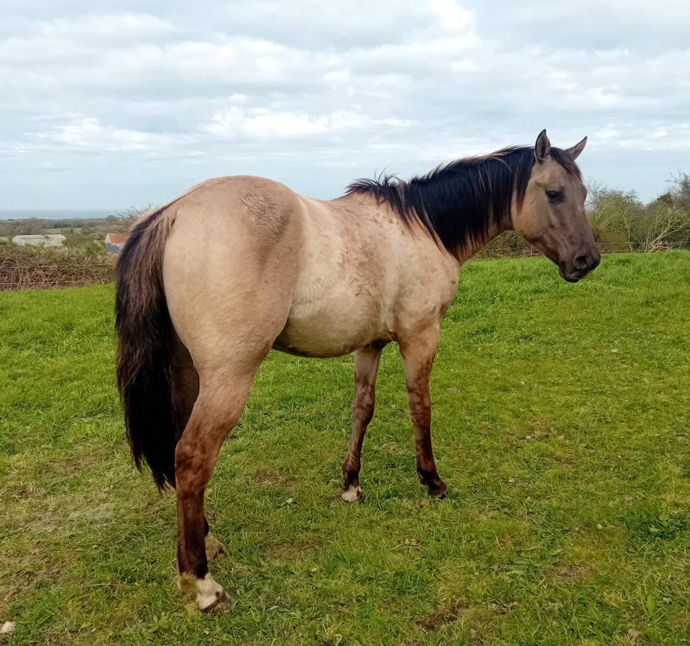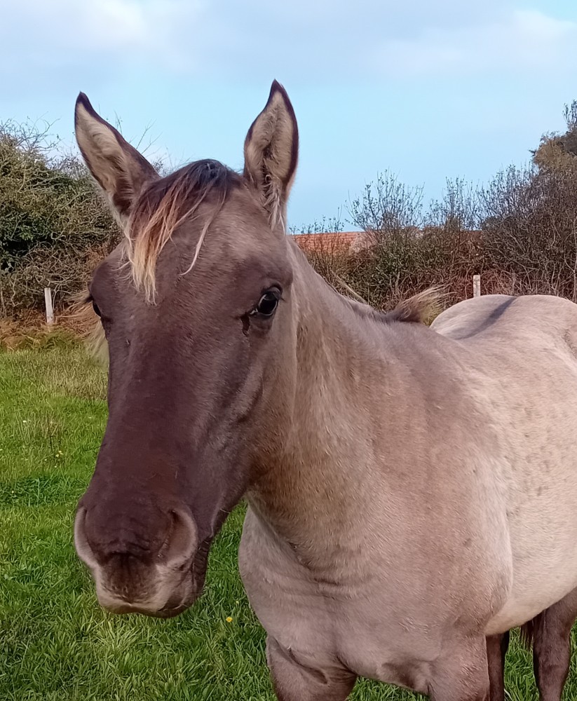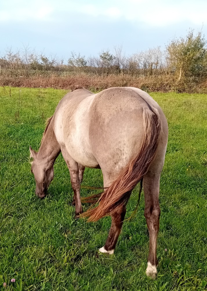 - Couleur : grullo EE aa D/nd2 TT - double homozygote noir et tobiano